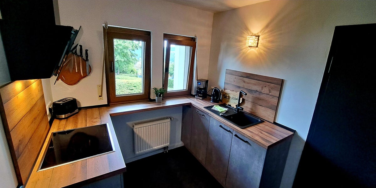 Küchen: Filterkaffeemaschine, Toaster, Wasserkocher, Backofen mit integrierter Mikrowellenfunktion, Radio mit Bluetooth, Induktionskochfeld und Spülmaschine. Esstisch mit gemütlichen Stühlen und Kindersitz,Töpfe und Pfannen, Besteck und Geschirr, Schüsseln, Gläser etc. gehören zur normalen Grundausstattung.